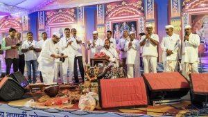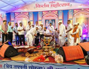 चिंचोली (ता. जळगाव) येथे आयोजित राष्ट्रीय कीर्तन महोत्सवात प्रसिद्ध कीर्तनकार, रामायणकार ह. भ. प. रामराव ढोक महाराज यांच्या आजच्या कथेत पालकमंत्री ना. श्री. गुलाबरावजी पाटील यांचा ह. भ. प. ढोक महाराजांच्या शुभहस्ते सत्कार करण्यात आला. तसेच त्यांच्या शुभहस्ते आरती करण्यात आली.