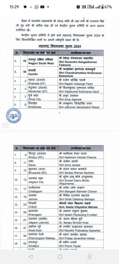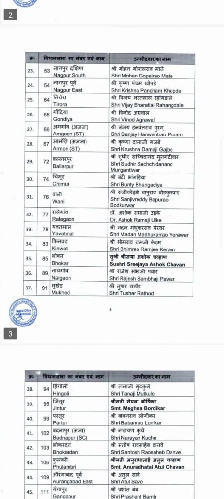 महाराष्ट्र विधानसभा निवडणुकीसाठी भारतीय जनता पक्षाकडून पहिली उमेदवारी जाहीर झाली आहे. पाहा यादी