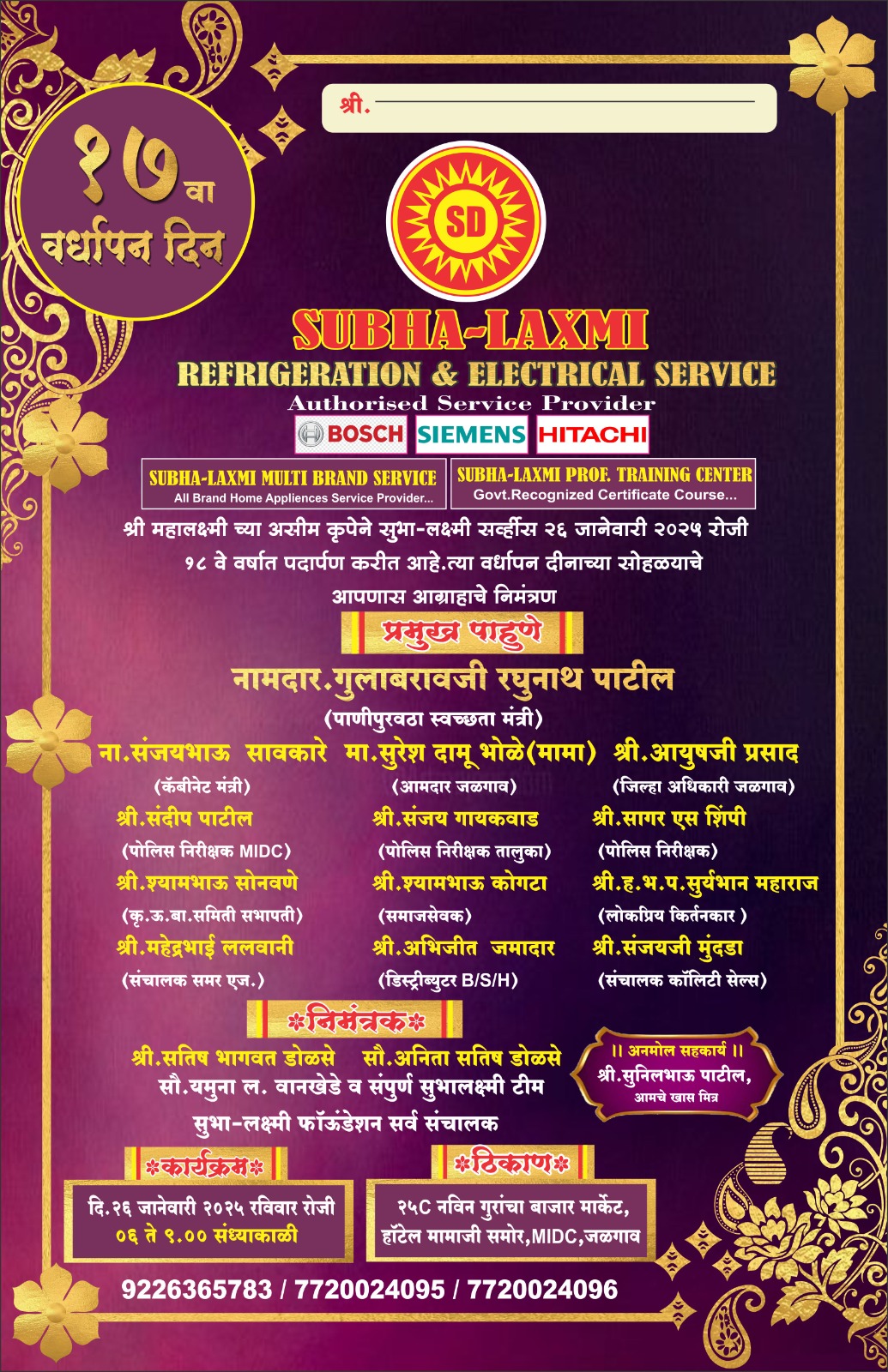 सुभा-लक्ष्मी रेफ्रिजरेशन & इलेक्ट्रिकल सर्व्हिस, जळगाव, २६ जानेवारी २०२५ रोजी आपल्या 17 व्या वर्धापन दिनानिमित्त एक भव्य सोहळा आयोजित करत आहे. सुभा-लक्ष्मी सर्व्हिस हे एक प्रतिष्ठित मल्टी ब्रँड सेवा पुरवठा करणारे संस्थान आहे, जे बोश, सिमेन्स, हिटाची आणि अन्य विविध ब्रँडसाठी उत्कृष्ट सेवा उपलब्ध करीत आहे. सुभा-लक्ष्मी टीम आपल्या कार्यक्षेत्रात विश्वसनीयता आणि गुणवत्ता यासाठी ओळखली जाते.