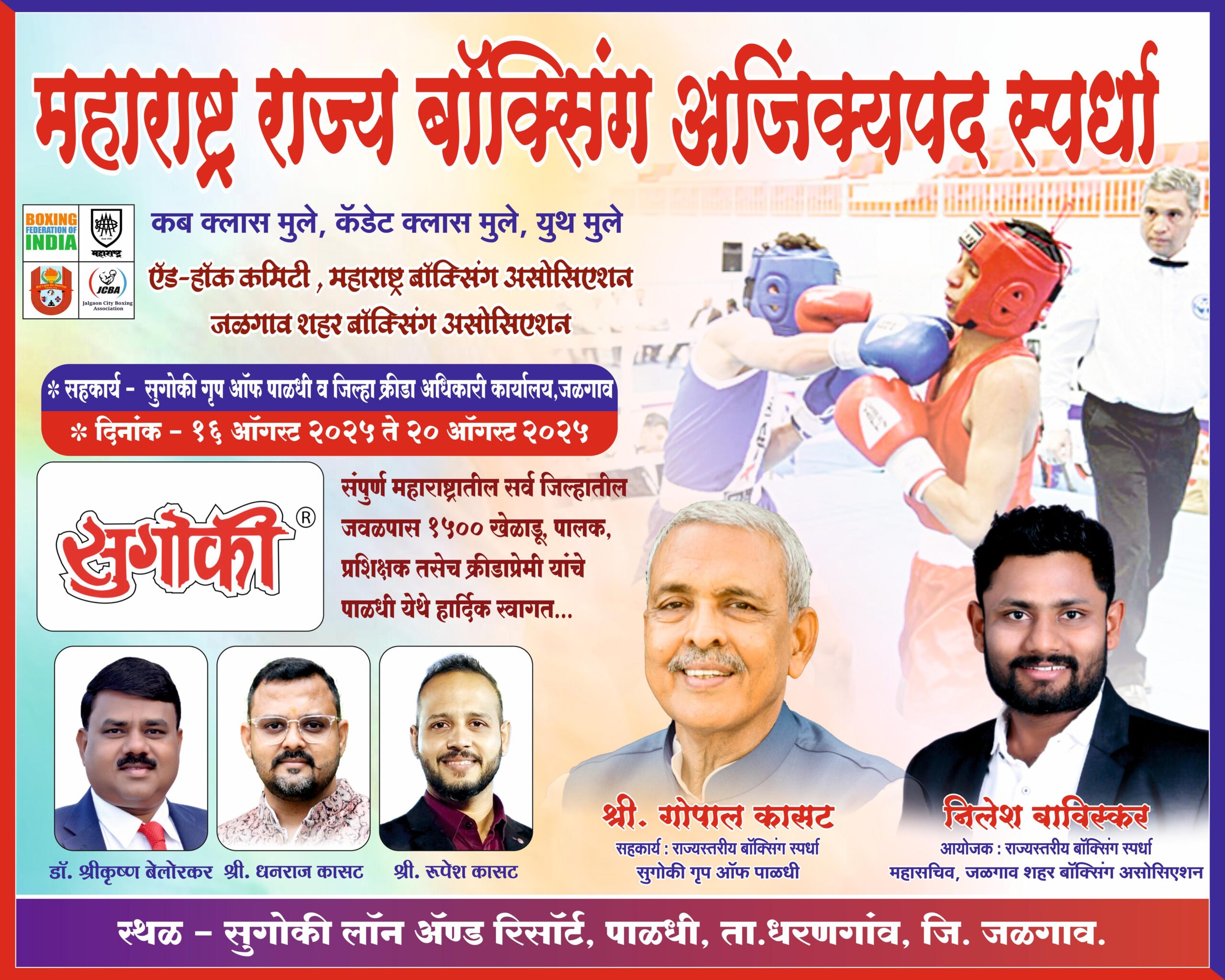 उद्योगपती श्री. गोपाल कासट यांचे विशेष सहकार्य प्राप्त झाले असून, राज्यस्तरीय बॉक्सिंग स्पर्धा—सुगोकी ग्रुप ऑफ पाळधी या उपक्रमातून लॉजिस्टिक व सुविधा उभारणी वेगाने पूर्ण करण्यात आली आहे.