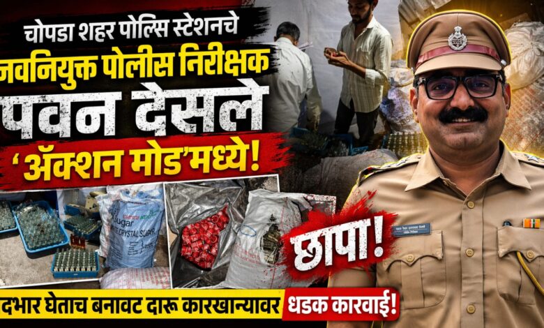 चोपडा: चोपडा शहर पोलीस स्टेशनचा पदभार नुकताच स्वीकारलेले नवनियुक्त पोलीस निरीक्षक पवन प्रतापराव देसले हे पहिल्याच दिवसापासून ‘ॲक्शन मोड’मध्ये आले आहेत. पदभार स्वीकारताच त्यांनी धडक कारवाई करत चोपडा परिसरातील अकुळखेडा शिवारात सुरू असलेल्या एका बनावट विदेशी दारू बनवणाऱ्या कारखान्यावर छापा टाकून तो उद्ध्वस्त केला आहे. या कारवाईत तिघांवर गुन्हे दाखल करण्यात आले असून १ लाख ८ हजार ८० रुपयांचा मुद्देमाल जप्त करण्यात आला आहे. पोलीस निरीक्षकांच्या या वेगवान कारवाईमुळे शहरातील अवैध धंदेवाल्यांचे धाबे दणाणले आहेत.